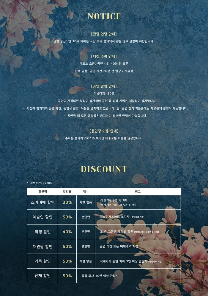 해당 공연은 공연예술통합전산망에서 제공되었으며, 통신판매의 당사자가 아니므로 상품의 예약, 이용 및 환불 등 거래와 관련하여 틱스코리아는 일체 책임을 지지 않습니다.