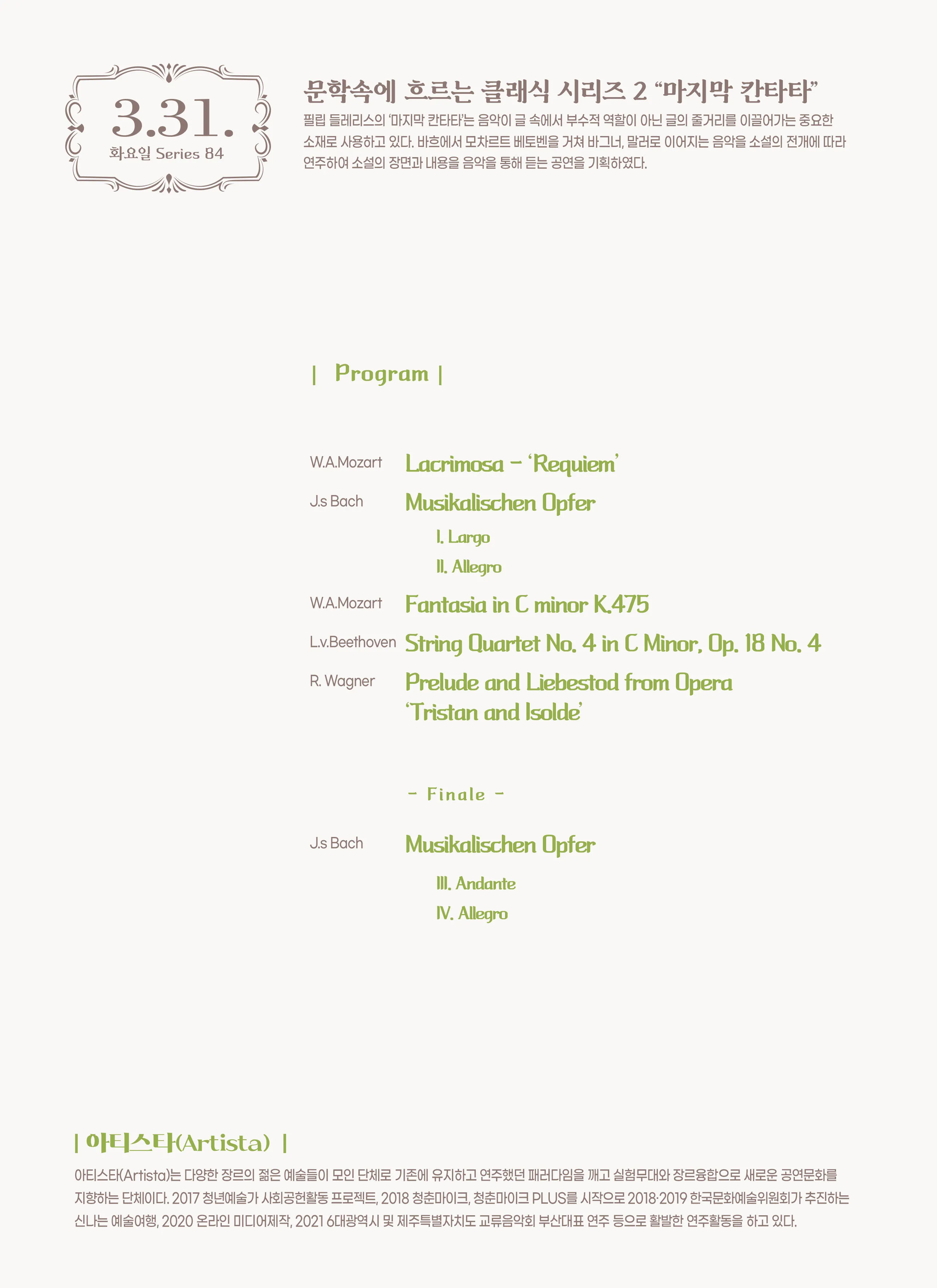 • 제84회 을숙도 예술공감, 문학속에 흐르는 클래식 시리즈 2. 마지막 칸타타제84회 을숙도 예술공감, 문학속에 흐르는 클래식 시리즈 2. 마지막 칸타타
