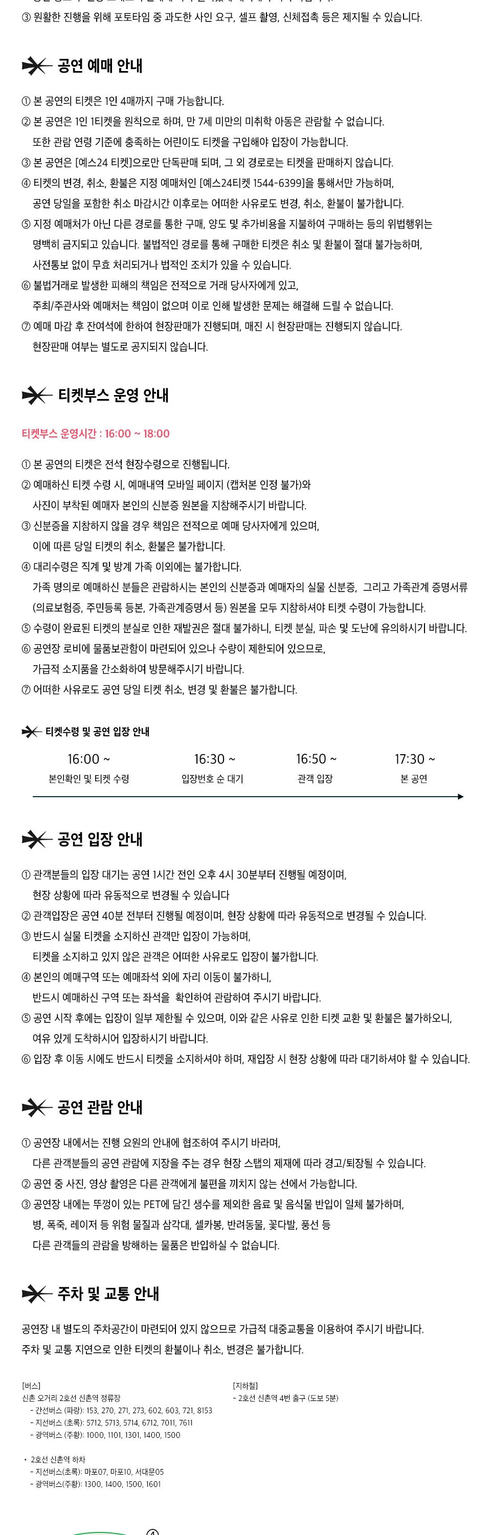 해당 공연은 공연예술통합전산망에서 제공되었으며, 통신판매의 당사자가 아니므로 상품의 예약, 이용 및 환불 등 거래와 관련하여 틱스코리아는 일체 책임을 지지 않습니다.