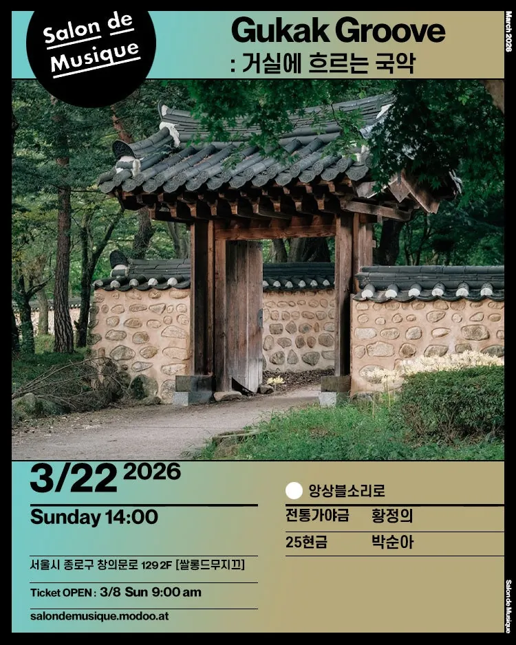본 공연은 전통 가야금과 25현 가야금으로 아리랑, 산조, 민요, 대중적으로 익숙한 선율을 엮은 해설형 공연이다.전통음악의 깊이와 현대적 재해석을 함께 소개하며, 살롱 공간에서 관객과 소통하는 친밀한 음악 경험을 제안한다.