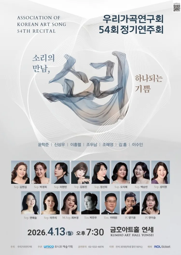 우리가곡은 단순한 노래를 넘어, 한국인의 삶과 감정을 고스란히 담아내는 소중한 우리의 유산입니다. 이번 연주회는 우리가곡을 대표하는 시대별 작곡가들의 곡을 관객들이 친숙하게 접할 수 있도록 독창과 듀엣, 그리고 4중창 등 다채로운 스테이지로 구성해 보았습니다. 또한 이번 연주회는 관객들과 함께 부르는 가곡으로 마무리하며 모두가 하나 되어 우리가곡을 기념하고, 기리고자 합니다.