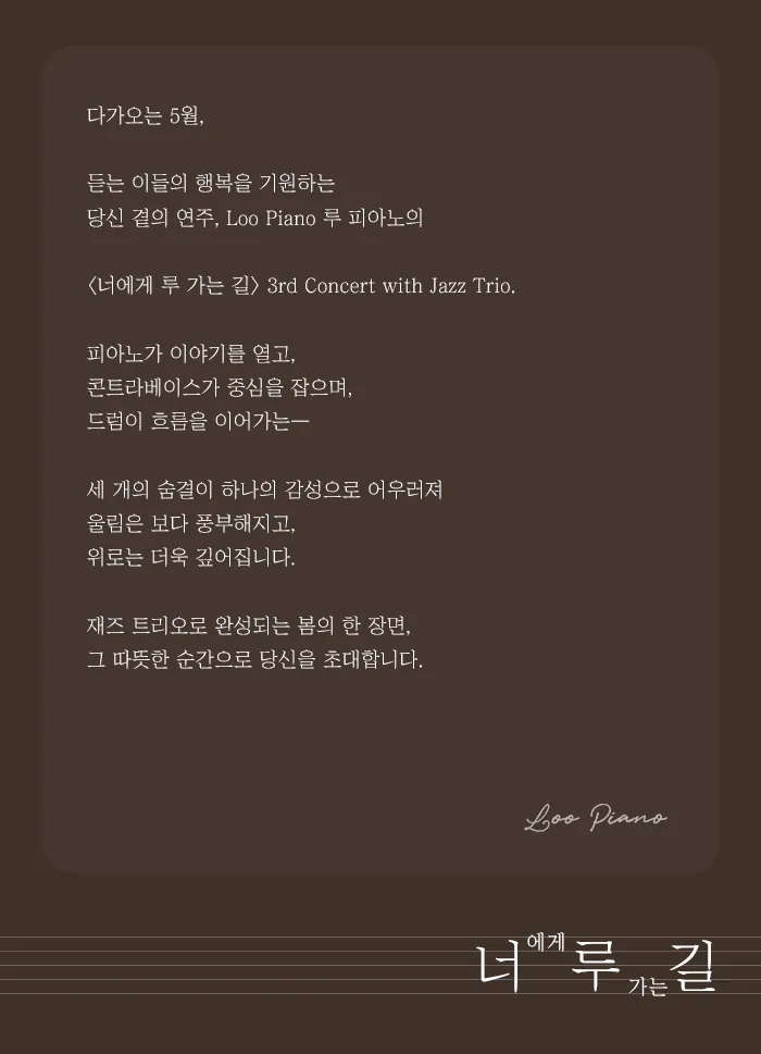 • 루 피아노 3rd Concert: 너에게 루 가는 길 with. Jazz Trio루 피아노 3rd Concert: 너에게 루 가는 길 with. Jazz Trio루 피아노 3rd Concert: 너에게 루 가는 길 with. Jazz Trio루 피아노 3rd Concert: 너에게 루 가는 길 with. Jazz Trio