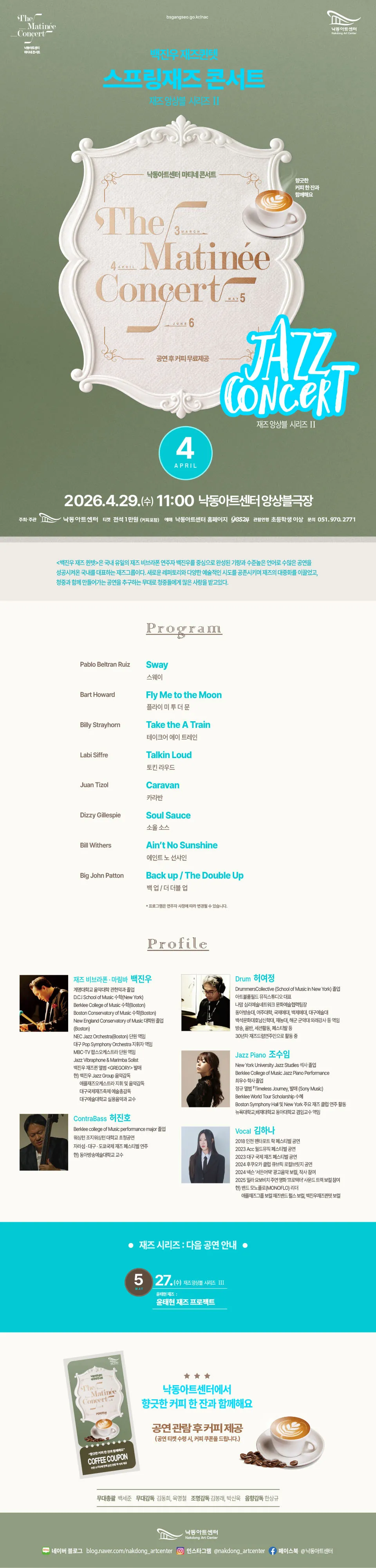 • 낙동아트센터 마티네 콘서트, 재즈앙상블 시리즈 Ⅱ. 백진우 재즈퀸텟: 스프링재즈 콘서트 [부산]