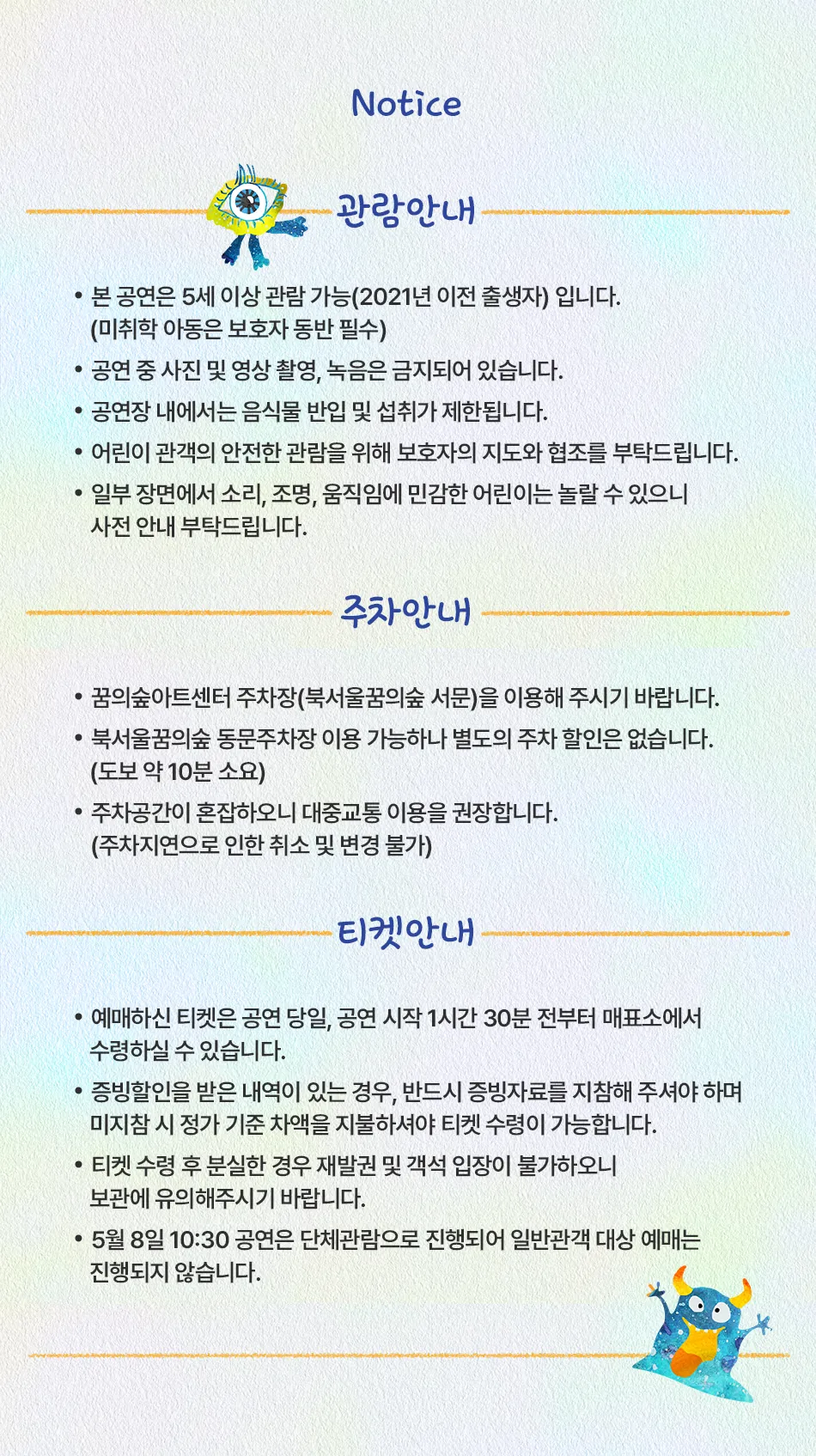해당 공연은 공연예술통합전산망에서 제공되었으며, 통신판매의 당사자가 아니므로 상품의 예약, 이용 및 환불 등 거래와 관련하여 틱스코리아는 일체 책임을 지지 않습니다.