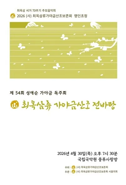특히 올해는 최옥삼류 선생의 서거 70주년이 되는 해로써 이를 추모하기 위해 ‘제54회 성애순가야금 독주회’를 준비하여 최옥삼류 가야금산조 전바탕을 연주한다.