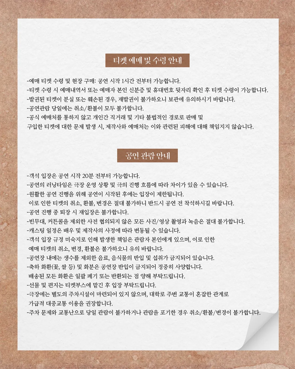해당 공연은 공연예술통합전산망에서 제공되었으며, 통신판매의 당사자가 아니므로 상품의 예약, 이용 및 환불 등 거래와 관련하여 틱스코리아는 일체 책임을 지지 않습니다.