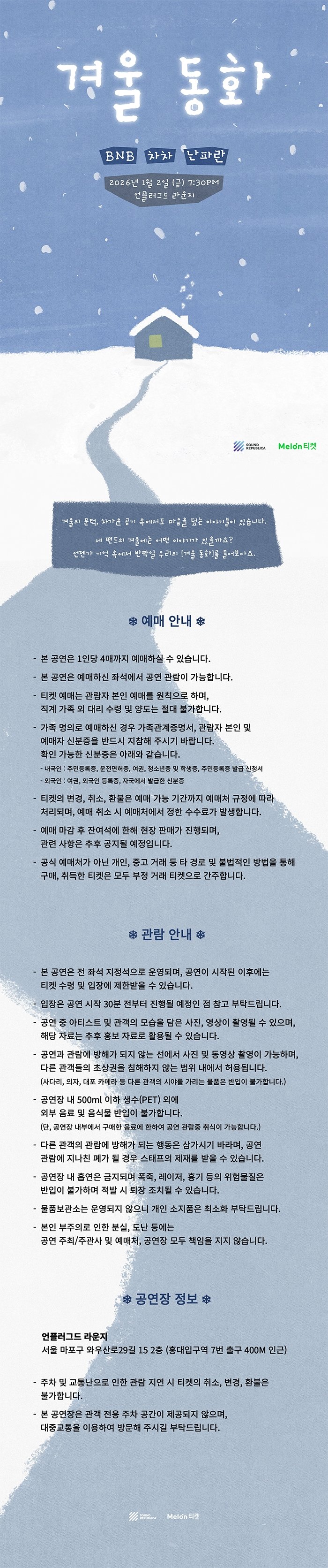 해당 공연은 공연예술통합전산망에서 제공되었으며, 통신판매의 당사자가 아니므로 상품의 예약, 이용 및 환불 등 거래와 관련하여 틱스코리아는 일체 책임을 지지 않습니다.