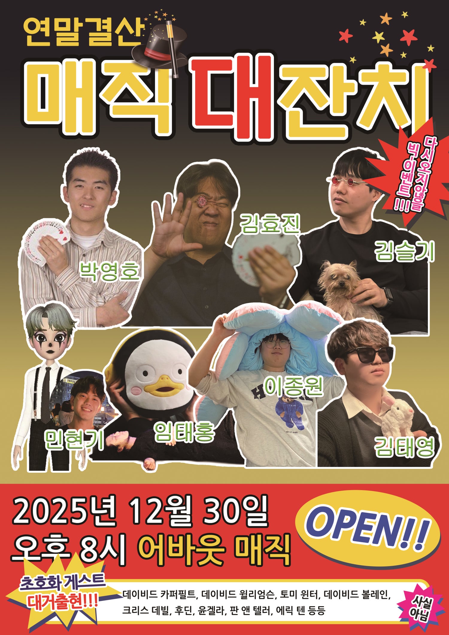 [공연소개] 2025 어바웃매직의 한해를 마무리하는 공연입니다. 한 해동안 어바웃매직을 찾아주신 여러분들에게 선물 같은 공연을 준비했습니다. 항상 어바웃 매직을 지지해주셨던 분들과의 공연입니다. 다양한 모습을 선보일 예정입니다. 많은 참석 부탁드립니다.