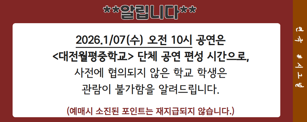 해당 공연은 공연예술통합전산망에서 제공되었으며, 통신판매의 당사자가 아니므로 상품의 예약, 이용 및 환불 등 거래와 관련하여 틱스코리아는 일체 책임을 지지 않습니다.