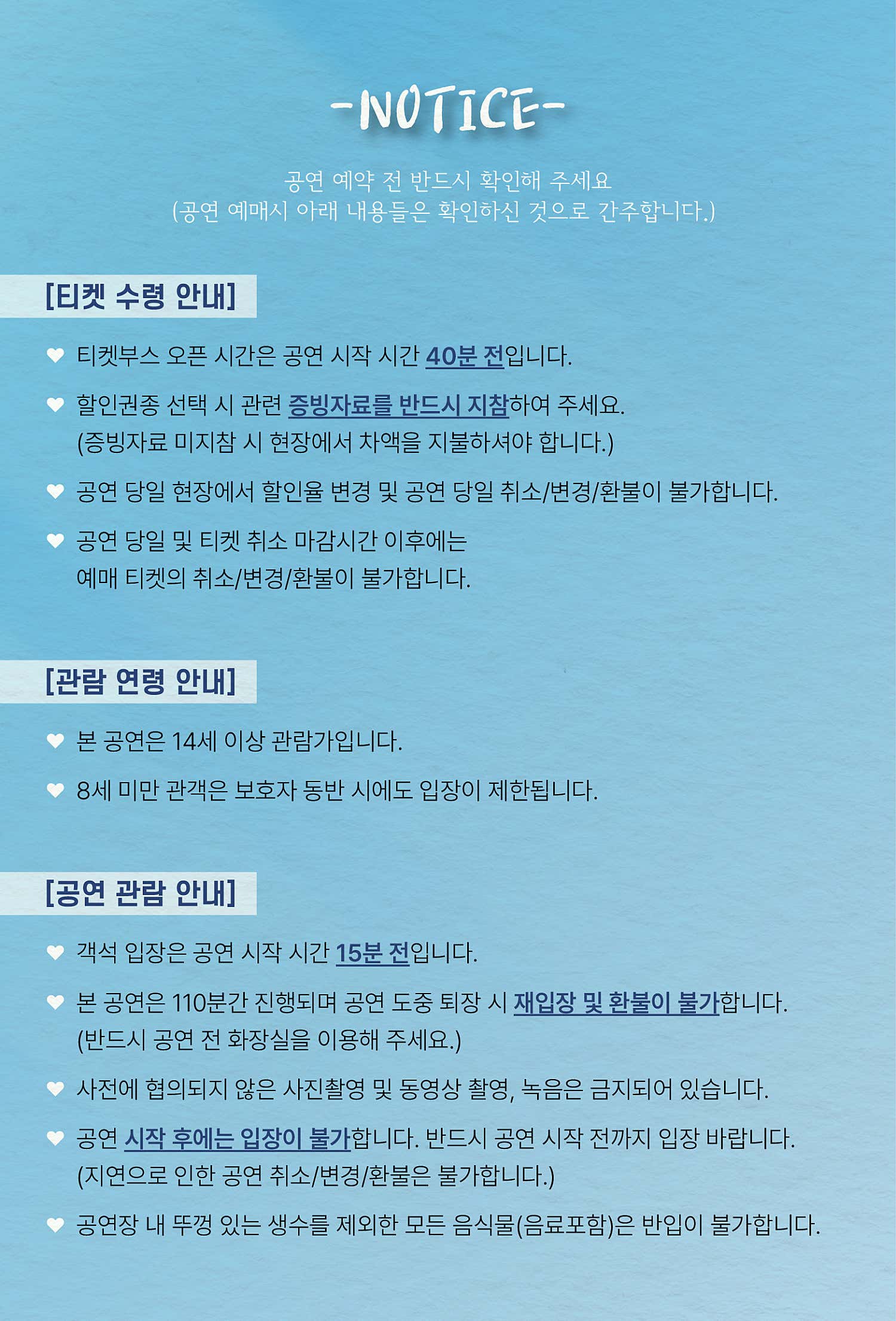 해당 공연은 공연예술통합전산망에서 제공되었으며, 통신판매의 당사자가 아니므로 상품의 예약, 이용 및 환불 등 거래와 관련하여 틱스코리아는 일체 책임을 지지 않습니다.