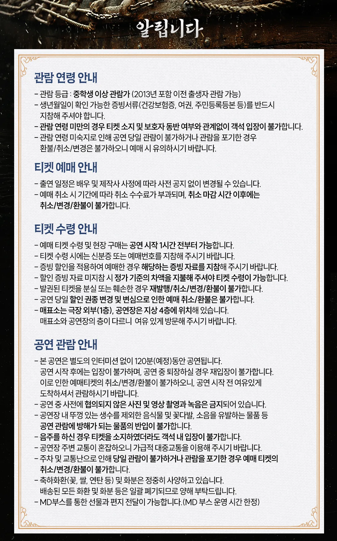 해당 공연은 공연예술통합전산망에서 제공되었으며, 통신판매의 당사자가 아니므로 상품의 예약, 이용 및 환불 등 거래와 관련하여 틱스코리아는 일체 책임을 지지 않습니다.