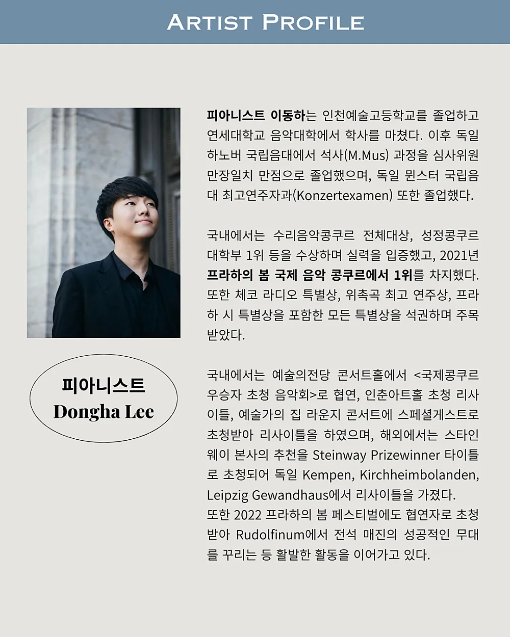 체코 <프라하의 봄 국제 콩쿠르> 수상에 빛나는 피아니스트 이동하를 초청,
