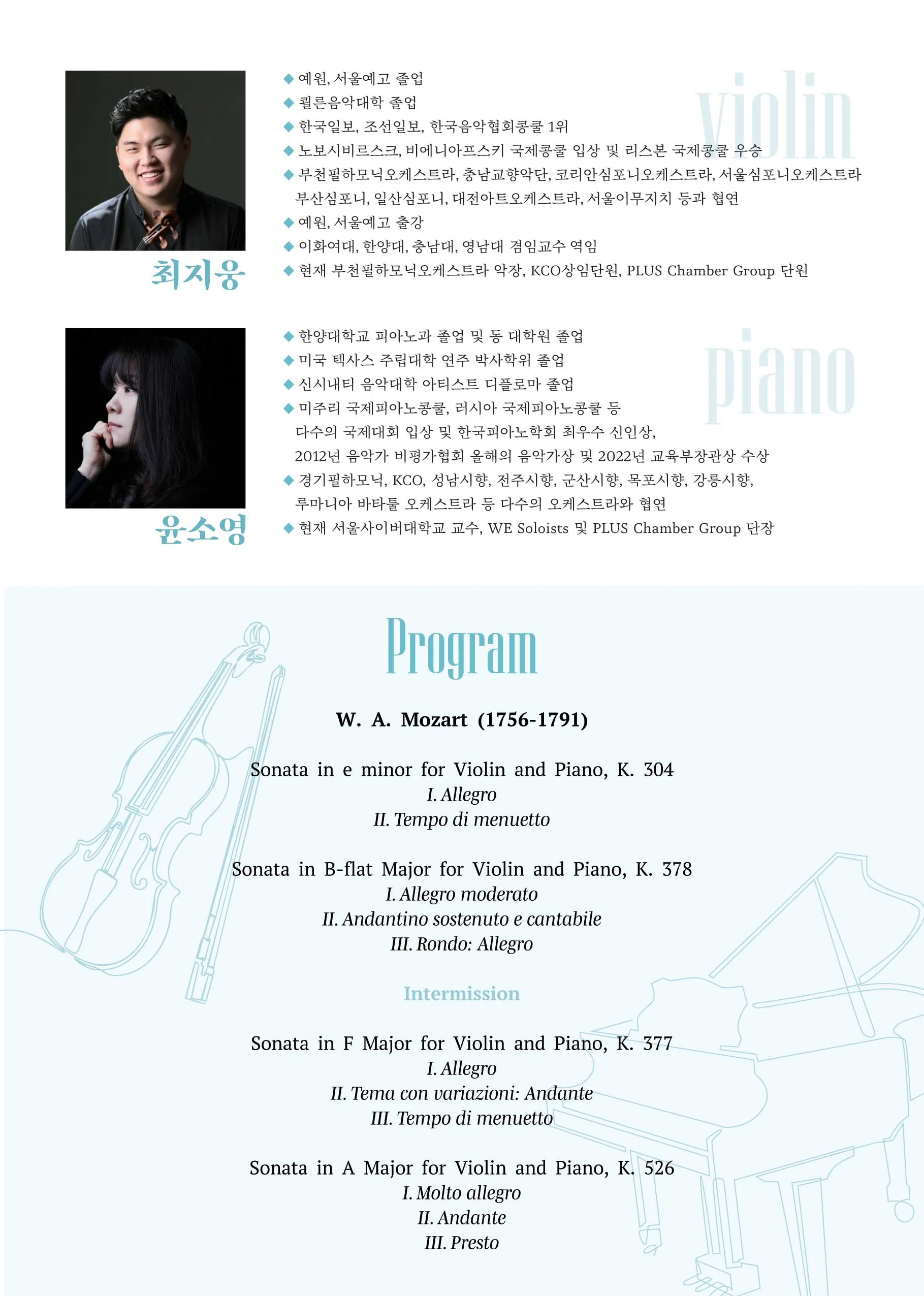 • 최지웅 윤소영 듀오 연주회: 모차르트 소나타 전곡 시리즈 Ⅳ최지웅 윤소영 듀오 연주회: 모차르트 소나타 전곡 시리즈 Ⅳ