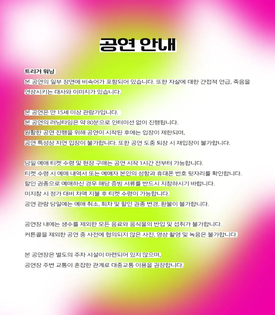 해당 공연은 공연예술통합전산망에서 제공되었으며, 통신판매의 당사자가 아니므로 상품의 예약, 이용 및 환불 등 거래와 관련하여 틱스코리아는 일체 책임을 지지 않습니다.
