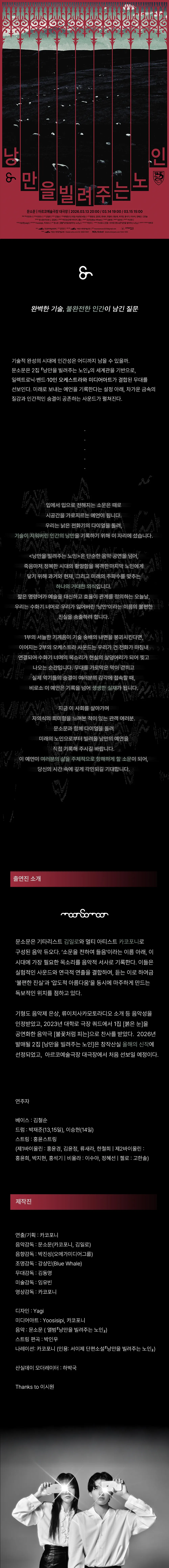 해당 공연은 공연예술통합전산망에서 제공되었으며, 통신판매의 당사자가 아니므로 상품의 예약, 이용 및 환불 등 거래와 관련하여 틱스코리아는 일체 책임을 지지 않습니다.