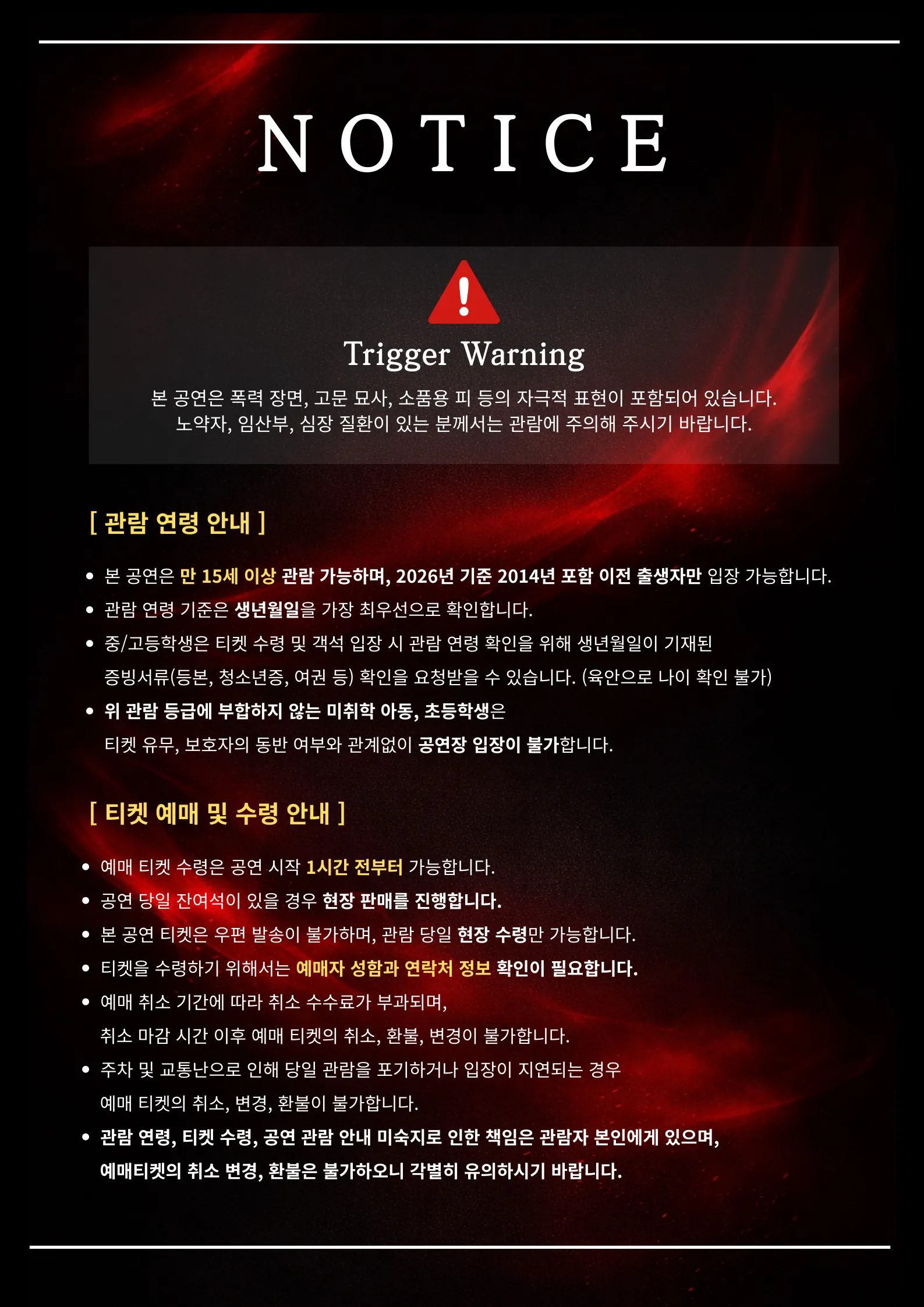 해당 공연은 공연예술통합전산망에서 제공되었으며, 통신판매의 당사자가 아니므로 상품의 예약, 이용 및 환불 등 거래와 관련하여 틱스코리아는 일체 책임을 지지 않습니다.