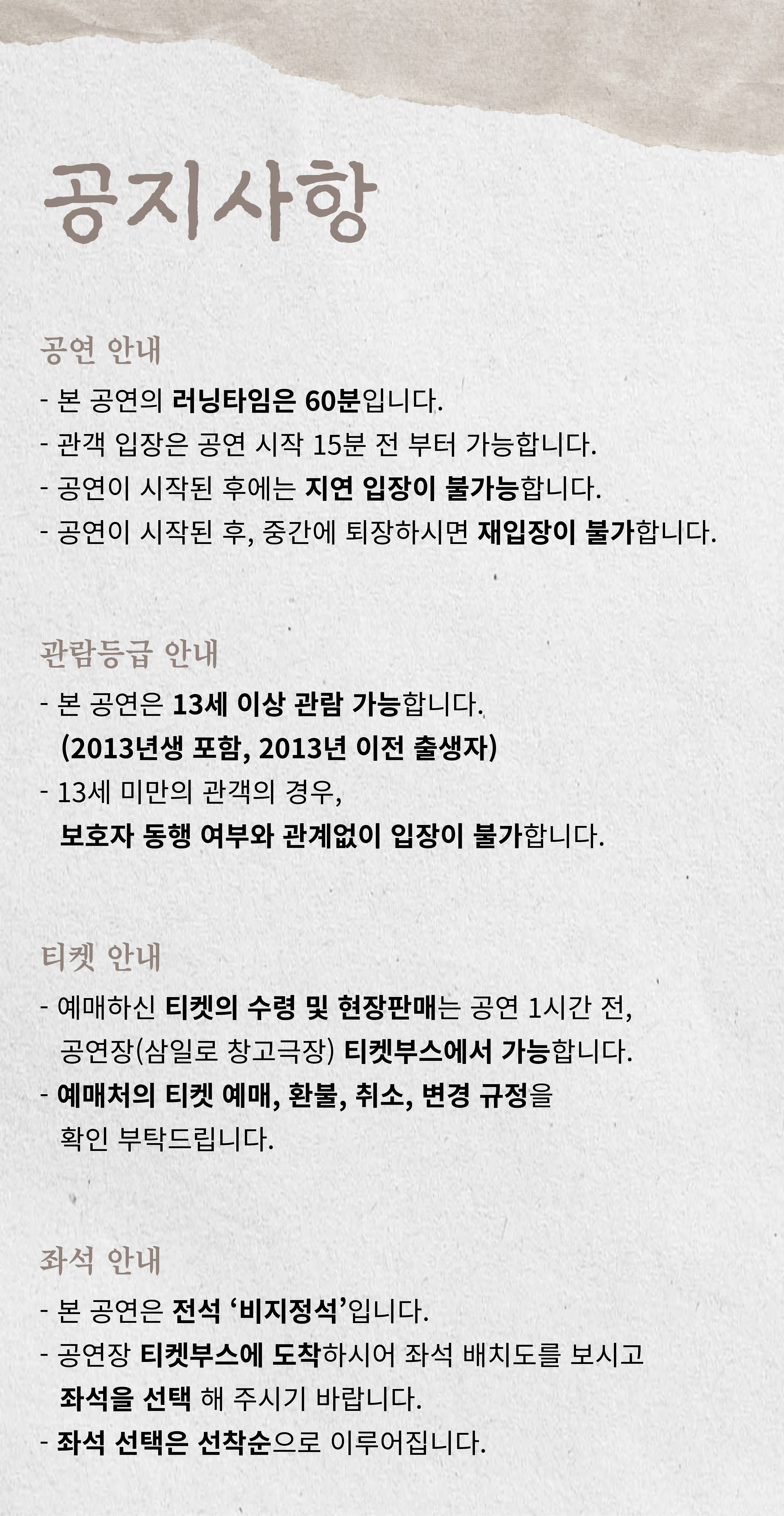 해당 공연은 공연예술통합전산망에서 제공되었으며, 통신판매의 당사자가 아니므로 상품의 예약, 이용 및 환불 등 거래와 관련하여 틱스코리아는 일체 책임을 지지 않습니다.